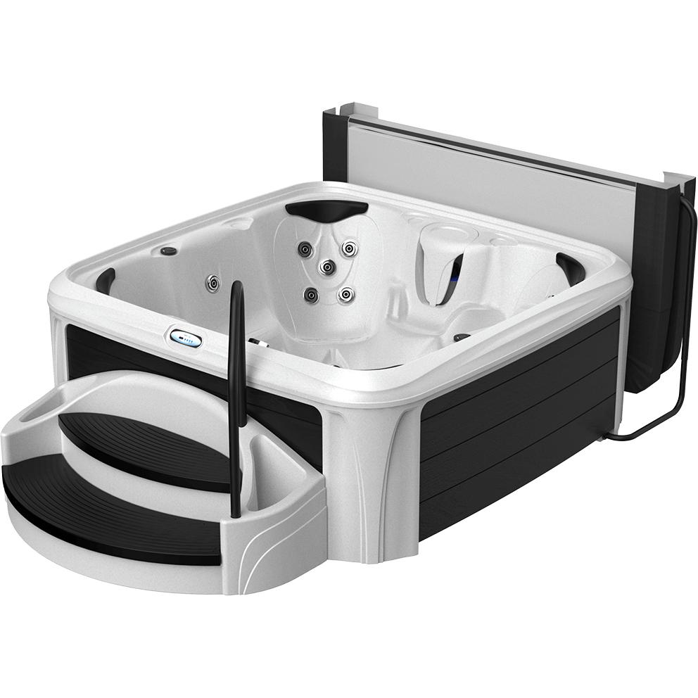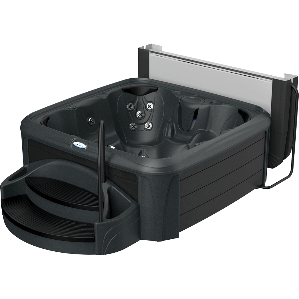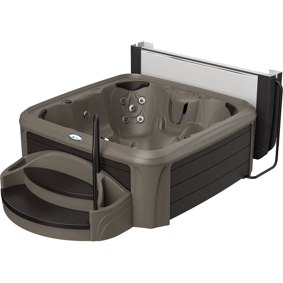 Angled view of the DreamMaker Spas Comfort 2300S Suite in a glossy White Syncrylic™ finish with black woodgrain-style cabinet panels. Features include wide integrated Suite Steps with non-slip treads, a sturdy handrail, two side planters, and a bonus step-storage compartment. The open cover is mounted on a built-in cover lifter. The spa interior showcases ergonomic seating for 6-7 people, 23 adjustable hydrotherapy jets, comfort headrests, and digital controls—designed for backyard relaxation, accessibility, and luxury. Angled side view of the DreamMaker Spas Comfort 2300S Suite in White Syncrylic™ with modern grey cabinet panels and grey-accented integrated Suite Steps. The spa features a slip-resistant step system with a black handrail, dual planter zones, and hidden storage under the steps. An easy-lift cover lifter holds the spa cover upright. Interior seats accommodate 6–7 people with 23 massage jets, digital controls, comfort headrests, LED-lit water fountain, and illuminated footwell—designed for backyard hydrotherapy and style. Angled side view of the DreamMaker Spas Comfort 2300S Suite in sleek black Syncrylic™ with matching black cabinet panels and accessories. Features wide integrated Suite Steps with textured black treads, a sturdy black handrail, two built-in planters, and hidden storage. Includes a mounted cover lifter holding the insulated Weather Shield cover upright. The interior offers ergonomic seating for 6–7 people, 23 hydrotherapy jets, soft headrests, digital controls, and vibrant LED lighting for a luxurious, modern backyard spa experience. Angled side view of the DreamMaker Spas Comfort 2300S Suite in elegant Mystic grey Syncrylic™, paired with black cabinet panels. The spa features built-in Suite Steps with slip-resistant Mystic grey treads, a sturdy black handrail, two integrated planters, and a hidden storage compartment. A matching cover lifter holds the thermal Weather Shield cover upright for easy use. Inside, the 6–7 person interior is equipped with 23 adjustable hydrotherapy jets, comfort headrests, and LED lighting in the footwell and water fountain for a soothing spa experience. Side view of the DreamMaker Spas Comfort 2300S Suite in Sahara Syncrylic™, showcasing a smooth brown shell and dark espresso cabinet panels. This 6–7 person spa features built-in Suite Steps with slip-resistant Sahara treads, a secure black handrail, and dual side planters with integrated step storage. The included Cover Lifter holds the insulated Weather Shield cover upright. Inside, 23 adjustable jets, pillow headrests, and ambient LED lighting offer a complete hydrotherapy and relaxation experience.